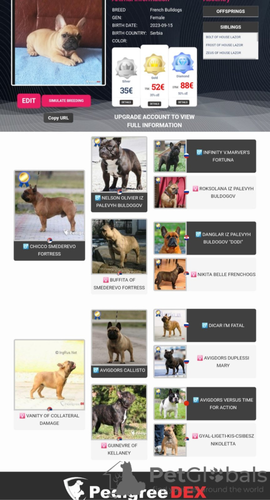 Hodowla Buldogów Francuskich FCI 6478 Smederevo Fortress oferuje jednego szczeniaka i jedną suczkę w wieku 4 miesięcy z potencjałem wystawowym, o wyjątkowych liniach uznanych i znanych na świecie, które mają w swoim pochodzeniu mistrzów świata i Europy.
